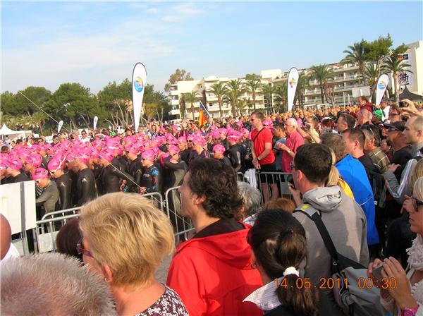 1. Inainte de start. La 5 dimineata, restaurantul hotelului in care am stat era plin de oameni, care isi faceau ‘plinul’ pentru multele ore care ii asteptau in apa, pe bicla sau in alergare. Cei mai nororcosi si mai rapizi dintre ei urmau sa prinda masa de pranz; ceilalti, printre care si eu, luau in calcul direct cina… La 6.00, autobuzul era in fata hotelului si urcam in el. Printre noi, un grup de vreo 10 irlandezi, foarte galagiosi, unii dintre ei inarmati cu vuvuzele… 🙂 La 6.30 eram lasati in zona de tranzitie, unde se putea sta doar pana la ora 8.00. Se fac ultimele verificari ale bicicletelor – cate o pompa, cate un surub…  Un pic paranoic, ma duc la standurile unde agatasem in ziua precedanta punga albastra (cu lucrurile pentru bicicleta) si cea rosie (pentru alergare). Sunt la locul lor (ce usurare ! :)) si incerc sa memorez bine locatia lor, pentru a fi sigur ca le voi gasi usor cand ies din apa, respectiv dupa proba de bicicleta. Intre timp, soarele ne ofera un rasarit de nota 10 si imi creste moralul… In jur de 7, o iau agale spre plaja, unde urmeaza sa aiba loc startul probei de inot. Acolo, incep sa apara profesionistii –care aveau sa inceapa primii, la ora 8.00. Ma uit la exercitiile lor de incalzire si incerc sa tin minte cateva, pentru a le ‘imita’ mai tarziu. Intru in vorba cu unul dintre ei si il intreb cum se poate concura la profesionisti. Imi spune ca, pentru a te califica la aceasta categorie, iti trebuie un timp cu maxim 8% mai slab decat cea mai buna perfomanta din anul respectiv (adica: daca recordul anului la un 70.3 este, de exemplu, 4 ore, toti cei care obtin un timp mai bun de aprox. 4h 20 min pot sa se inscrie la aceasta categorie). Pe la 7.30 plaja este deja plina, concurentii incep sa se echipeze, iar muzica sa rasune in difuzoare. Pe un remix Coldplay – Viva la vida decid ca este momentul sa ma echipez si eu. Pentru cei care nu au trait pe propria piele experienta echiparii cu un swimsuit, trebuie sa stiti ca nu este o misiune foarte usoara… Se foloseste o punga, pentru ca picioarele si mainile sa intre mai usor in costumul de ‘cauciuc’. Si asta nu inainte de a aplica o gramada de ‘body glide’ (vaselina…) in zonele in care frecarea va fi mai acentuata (in special la ceafa), pentru a evita diverse rani. De asemenea, costumul trebuie pus cu multa grija, folosind buricele degetelor (cu unghiile taiate bine in prealabil :)), pentru a nu il perfora. DIn fericire, el iese destul de repede (in cateva secunde). Dupa aproape 15 minute, reusesc sa il pun si sunt foarte mandru de ‘opera’ mea…