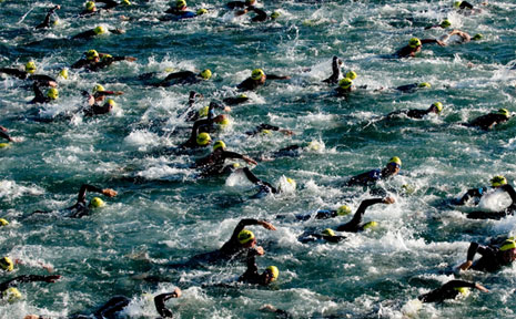 2. Proba de inot. La 8.00 se da startul profesionistilor, pe care il privesc din apa, la vreo 50 de metri de culoarul de concurs, unde intrasem pentru a ma obisnui cu marea si pentru a face cateva ‘sprinturi’. Profesionistii, cu vreo 3 viteze in plus fata de noi, inotatorii de rand, imi dau impresia ca au motor si elice… La 8.10 urmeaza startul ‘castilor roz’, adica al doamnelor. Ma astept la un start mult mai linistit decat cel al profesionistilor, dar realitatea ma contrazice. O imensitate de clabuci, o lupta ‘care pe care’…o atmosfera de masina de spalat scapata de sub control. La 8.20 se da startul categoriei  18-25 ani, iar DJ-ul invita in zona de start urmatoarele categorii, inclusiv a mea. Noi purtam casti verzi. Cei dinaintea noastra argintii si aurii, iar cei de dupa noi negre, apoi portocalii… Vine si momentul ‘eliberarii’. Dupa o numaratoare inversa stresanta (“mai sunt 5 minute”, “mai sunt 4 minute”…, “10, 9, 8…” ), se aude pistolul si pornim cu totii catre apa (startul s-a dat pe plaja, urmand ca primii 50 de metri sa fie alergati pe uscat, apoi inca vreo 20-30 de metri sa fie parcursi in mers prin apa). Ma pozitionez ‘strategic’ in spatele celor 300 si ceva de inotatori (nu chiar ultimul, dar pe acolo…), pentru a evita renumitele coate si picioare in gura, alti inotatori trecand peste mine, multi litri de apa inghititi etc. Primii 50-100 de metri de inotat nu au nicio legatura cu ceea ce invatasem in piscina. Dau haotic din ce apuc, incerc sa ma mentin la suprafata apei si sa pastrez o anumita directie. In jurul meu doar spuma, asa ca mi-e greu sa imi dau seama incotro trebuie sa o apuc… 🙂 Evident, nu am curajul sa ma opresc (mai sunt cativa inotatori in spatele meu) si ma las dus de val. La un moment dat, simt un inotator trecand pe sub mine (!!), ceea ce imi provoaca o senzatie destul de neplacuta. Mai trec cateva minute, care par ore, si apa incepe sa se mai linisteasca [scriind aceste randuri, incep sa inteleg de ce 13 din cei 14 concurenti care au murit in ultimii ani la triatloane de acest fel si-au gasit sfarsitul la proba de inot… :(].