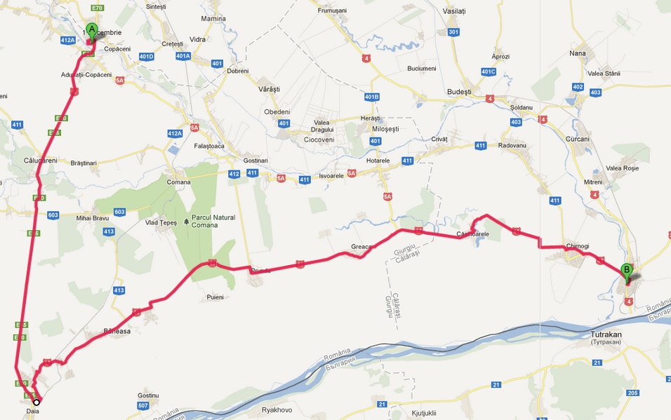 Traseu: DN5 Bucuresti – Giurgiu (Daia), apoi DN 41 (cred) Giurgiu (Daia) – Oltenita si retur.