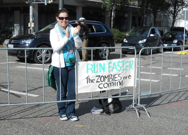 Fara aport de carbohidrati si electroliti, trebuie sa improvizam urgent. Pe parcursul unei curse, orice problema trebuie rezolvata atunci cand apare; daca lasam rezolvarea pentru mai tarziu…va fi prea tarziu. Gasim in drum o pizzerie, unde cerem si primim niste sare – solutia de avarie pentru a trece de km 28-30. Alergatul se transforma, usor-usor, intr-un mers accelerat. Este bine si asa – important este sa nu ne oprim sau sa mergem agale (ceea ce s-ar transforma si perpetua intr-un mars de Zombie…). Semi-maratonistii rapizi ne-au depasit, iar acum impartim ‘podeaua’ cu cei lenti si cu maratonistii incepatori sau cu problem e.