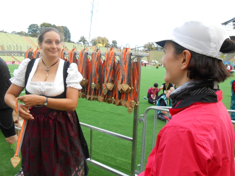 Urmatorii 4 kilometri trec rapid, iar ultimul ne gaseste in complexul olimpic, indreptandu-ne spre finish, care este amplasat pe pista stadionului. Ne uitam la ceas (care, a propos, a functionat excelent, abaterea a fost nesemnificativa) si ne bucuram: mai avem 20 de minute pentru a parcurge ultimele sute de metri si a ne incadra in termenul limita! Vad intrarea in stadion, deschid aparatul foto si pornesc filmarea – ar fi pacat sa nu avem ca amintire aceste momente! Urmeaza tura de stadion, un mic soc provocat de ecranul pe care era postat timpul (6h 07m – calculat, din fericire, din momentul startului pentru profesionisti – cu 20 de minute inainte noastra), trecerea de poarta finala, imbratisarile si pupicurile de rigoare, apoi medaliile (foarte frumoase, in forma de inimioara) primite de la o doamna imbracata in costum traditional bavarez…