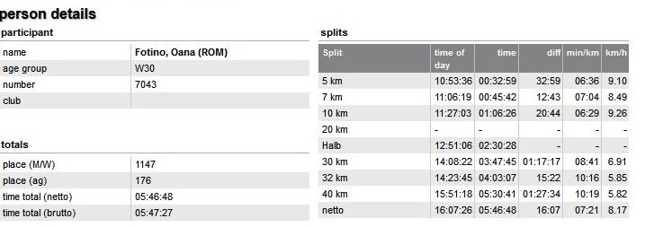 Asta a fost povestea primului meu maraton alergat dupa 16 luni de ultra-uri si triatloane, si a primului maraton din viata sotiei. De fapt, profit de ocazie pentru a lamuri un aspect: maratonul (42 de km si 195 de metri) nu exista! Exceptand cazul in care startul si finish-ul au loc in patul in care dormim, toate maratoanele sunt, de fapt… ultra maratoane! Intotdeauna vom avea de mers cateva sute de metri (sau kilometri) pana la start / finish si inapoi, plus 1-2 km la incalzire… Asadar, toti maratonistii sunt ultramaratonisti – in caz ca nu si-au dat seama pana acum. Ii invit pe toti cei care au alergat deja cei 42 de km sa faca pasul catre un ultra ‘real’, macar unul de 50 de kilometri. O sa fie bine!