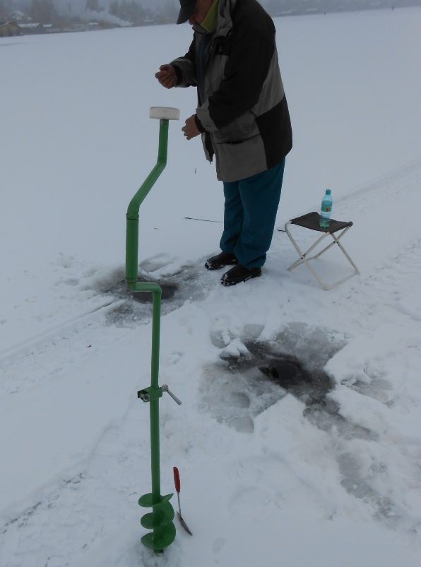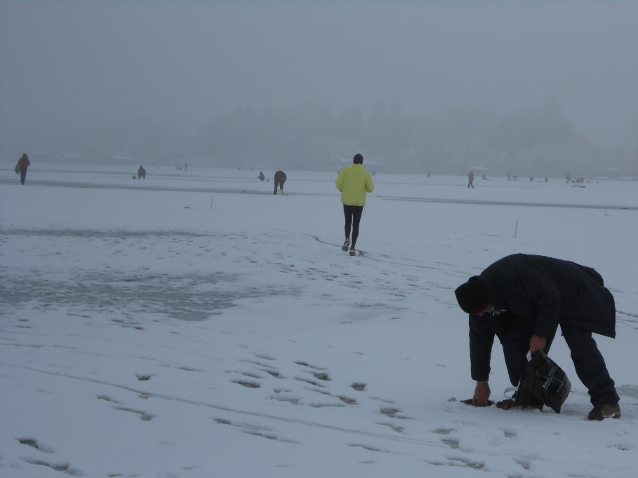 DSCN0592De fapt, ar fi fost imposibil sa fiu singur pe lac. Astazi am nimerit in mijlocul unui adevarat festival de pescuit la copca… 🙂 Nu am numarat pescarii, dar cred ca am intalnit cateva sute (ca sa nu spun o mie…) pe o distanta de 8 km (cat a masurat trasseul pe care l-am parcurs dus-intors). Mi-am imbogatit cultura generala in materie de instrumente de spart gheata: in afara clasicului topor, pe care il aveau foarte multi dintre pescari – ca intr-o reproducere a evenimentelor de la 1907…, am vazut si un fel de tirbuson urias, pe care unul dintre sateni mi-a spus ca l-a facut singur, dupa un model „gasit pe net” :). Daca va intrebati cum rezista pescarii la frig atatea ore; ei bine, ati ghicit: metoda clasica – sticle de apa plata pline cu palinca sau tuica…