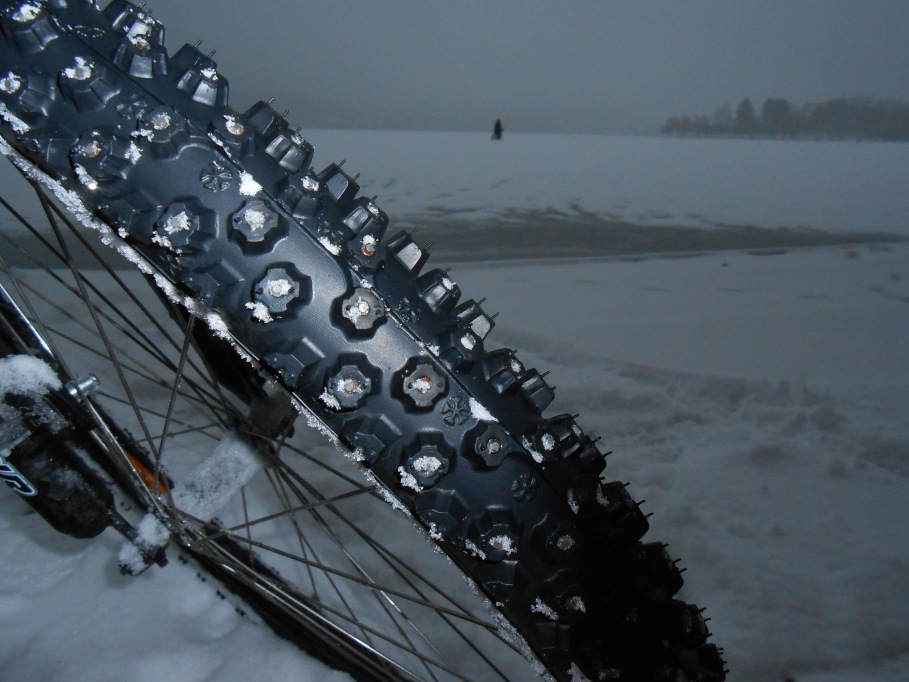 DSCN0568In plus, am luat la mine o folie de supravietuire, un termos cu ceai, telefonul etc. si am inlocuit casca de biciclist cu cea pe care o foloseam cand ma dadeam cu placa. Pentru a elimina orice probabilitate de derapare & cadere cu bicicleta, am dotat-o cu cauciucuri Schwalbe Ice Spiker, astfel incat pedalatul pe gheata & zapada a fost mai stabil decat vara pe asfaltul uscat… 🙂