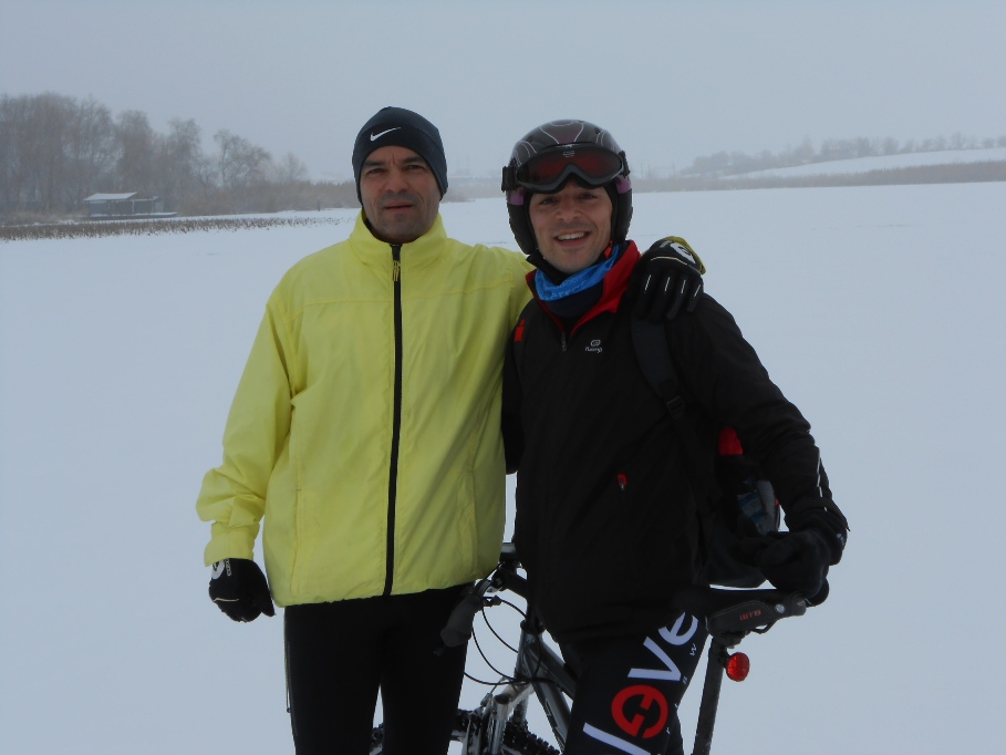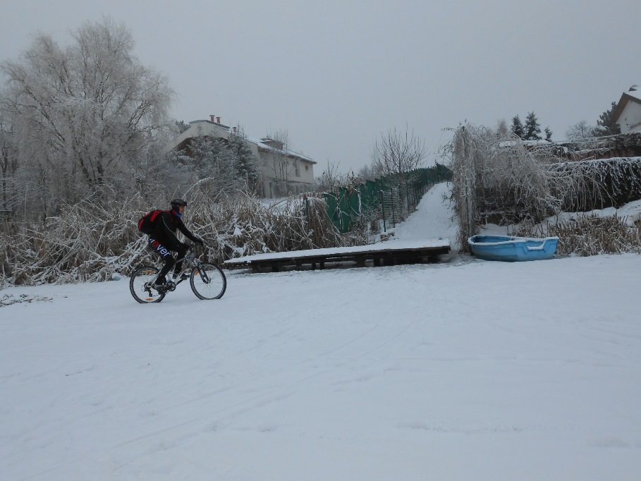 DSCN0617La intoarcere, am beneficiat de urmele facute de un ATV care tocmai tulburase linistea de pe lac si am putut alerga & pedala mai repede decat o facusem la dus (ce-i drept, ajutati si de increderea mult mai mare ca gheata ne va tine…). Ar mai fi de adaugat si faptul ca pedalatul pe gheata & zapada nu este deloc simplu – chiar daca stabilitatea este buna, efortul de a mentine o viteza cat de cat decenta a scos un pic untul din mine (a fost oarecum similar cu cel al urcarii de pante…).