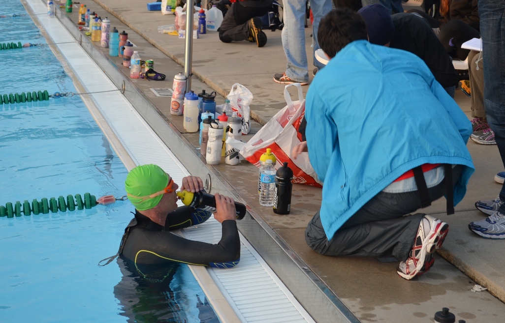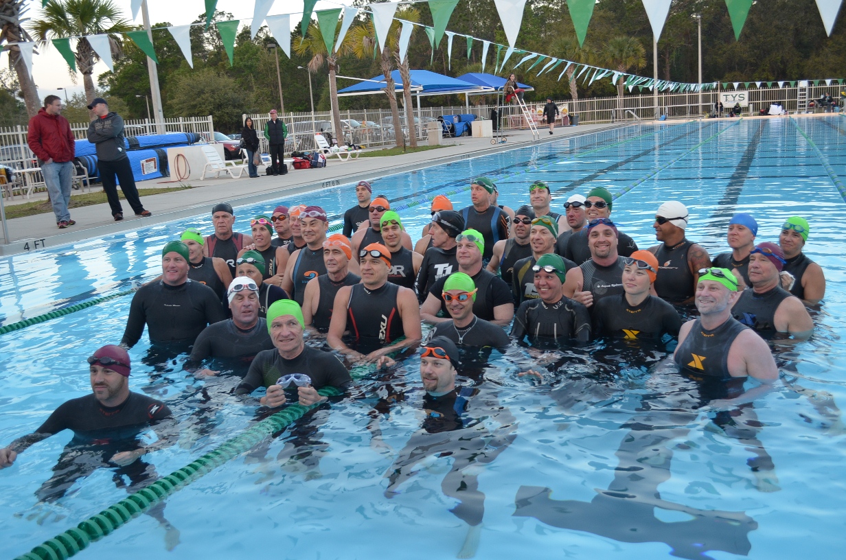 La 6 dimineata ajungeam, impreuna cu echipa de suport, la piscina YMCA din zona de nord a orasului Tampa. Nu stiu cate grade sunt acum in Romania, dar dimineata aceea era una foarte friguroasa in Tampa (vreo 7-8 grade), iar intratul in bazin a fost o mare bucurie, avand in vedere cele 22-23 de grade ale apei! Aproape de ora 7, Steve Kirby (organizatorul cursei) ne-a rugat sa ne strangem cu totii pe 2 culoare si sa facem o poza de grup, apoi ne-a amintit fiecaruia pe ce culoar urmeaza sa inotam. Am trait un deja-vu, pentru ca am inotat pe ultimul culoar, ca la Snagov Ultra Swim si alaturi de acelasi numar de inotatori (am fost in total 6 / culoar). Repartizarea pe culoare s-a facut functie de timpul de finish pe care l-a estimat fiecare la proba de inot, incepand de la 1h 50m (!!) – 2h (culoarul 1) si termind cu 3h 30m – 4h (al nostru).