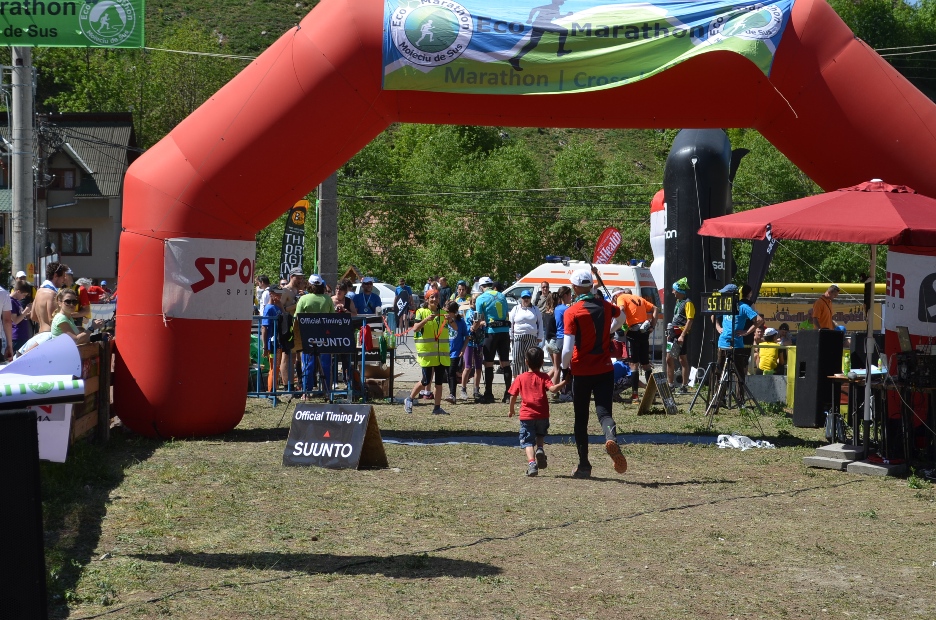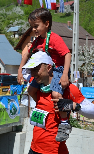 DSC_0104Cu cateva sute de metri inainte de final mi s-a alaturat Alex, care a trecut fericit alaturi de tati linia de sosire, primind si el o medalie, pe care a purtat-o in tot restul zilei… Timpul final: cateva minute sub sase ore (locul 149 din 404), la o cursa pe care as fi putut-o termina, probabil, in mai putin de cinci ore. Dar ar fi fost pacat, pentru ca as fi ratat, cu siguranta, niste pesisaje si momente unice… A doua zi, Alex a vrut sa alerge si el pe munte, asa ca ne-am cocotat pana la Crucea din Moeciu de Jos; a fost un efort binevenit dupa antrenamentul de revenire de dimineata… 🙂