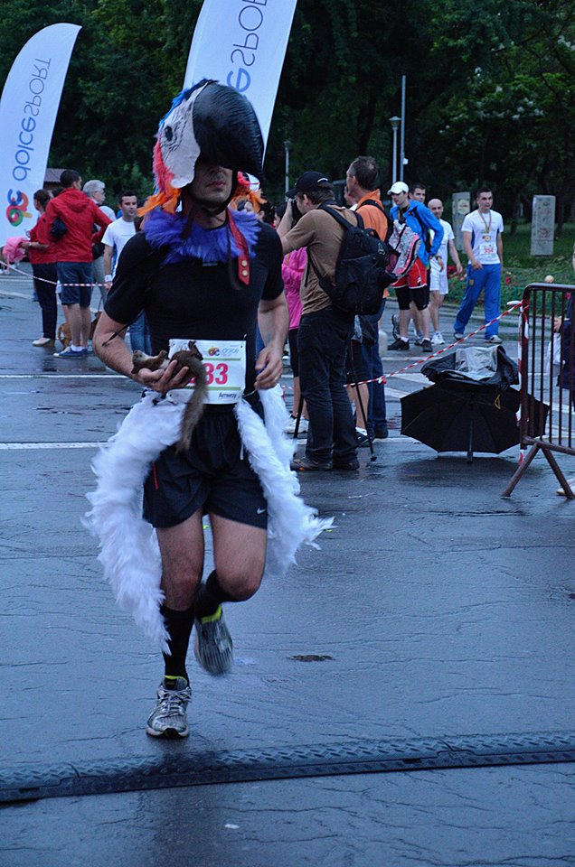 veverixPersonal, cursa de 10 kilometri mi-a dat ocazia sa alerg – in premiera – in Parcul Tineretului, decoperind o noua locatie superba pentru antrenamente :). Dincolo de asta, am avut ‘inspiratia’ de a alerga in costumul de ‘pupaza’, in ciuda faptului ca „ciocul” pupezei cantarea vreo 2 kilograme si imi ingreuna vederea… Desigur, nu speram ca acel cioc sa imi dea un plus de aerodinamism si sa realizez un PB, mai ales ca in dimineata evenimentului avusesem un long run, asa ca m-am multumit cu vreo 55 de minute… Deci, un cioc pe cap = minus 15-16 minute… :)))