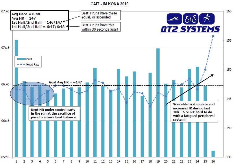 Ca antrenor de triatlon (si specific ca antrenor de Ironman), am dezvoltat multe strategii pentru cursa Kona. Executia in acest exemplu, insa, este una dintre cele mai bune pe care le-am vazut pana acum. Observa ca ritmul cardiac al lui Caitlin a fost tinut foarte bine sub control la inceputul cursei. Desi folosim efortul perceput, ritmul si pulsul pentru a urmari ziua de concurs, cel din urma este principala masuratoare, pentru ca se astepta ca ziua sa fie foarte calduroasa. In situatia curselor in temperaturi inalte, pulsul poate fi folosit pentru a explica acumularea potentiala caldurii, unde o strategie bazata pe ritm nu ar putea. Acumularea caldurii va rezulta de obicei intr-o decuplare dramatica intre ritm de alergare si ritm cardiac. De exemplu, ritmul cardiac va creste in primii kilometri ai cursei, desi ritmul incetineste sau ramane acelasi. Acesta este un indicativ al unui atlet care acumuleaza caldura mai repede decat o poate disipa. In majoritatea cazurilor, va cauza balonare si alte reactii deranjante, din cauza stresului provocat de caldura. Cand se intampla acest lucru, singura optiune reala a atletului este sa incetineasca ritmul si sa dea voie sistemului sa se echilibreze.