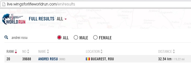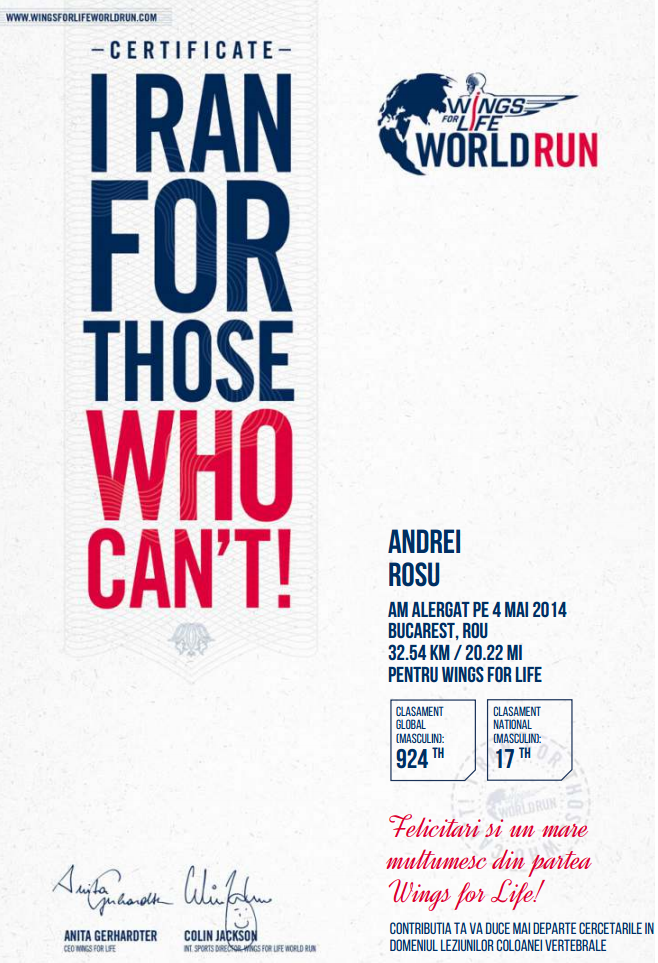 (-) Ce ar trebui imbunatatit: strategie de cursa si antrenamente adaptate la diferenta de nivel a traseului, gestionarea mai buna a intervalului 22-27 km. Antrenamente la ora concursului (99% din antrenamentele mele au loc dis-de-dimineata, indiferent de sezon, asa ca organismul meu nu este obisnuit cu caldura…). Referindu-ma la editia 2014 a Wings For Life World Run, as fi schimbat planul de antrenament: as fi pregatit-o (si abordat-o) ca pe o cursa de 30 de km, in loc de 42 :).