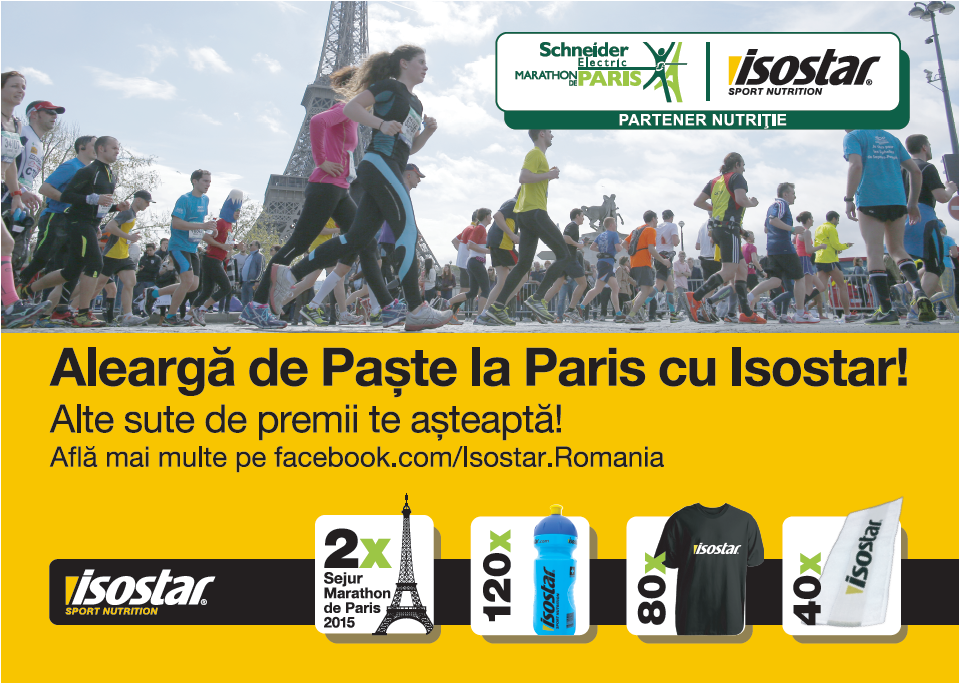 Pana pe 8 februarie 2015 (deci AMR 2 saptamani!), indiferent de sportul practicat si de nivelul de performanta, orice cumparator al produselor Isostar (in valoare minima de 30 lei, TVA inclus, pe un singur bon de casa/factura) se poate inscrie pe site-ul Provocarea Isostar sau prin aplicatia disponibila pe Facebook si intra in cursa pentru cele 240 de premii constand in accesorii Isostar (bidoane multisport, tricouri, prosoape) sau Marele Premiu – un sejur in doi cu cheltuieli incluse la Marathon de Paris, 12 aprilie 2015, Franta. Regulamentul promotiei poate fi consultat in mod gratuit pe pagina web a campaniei.