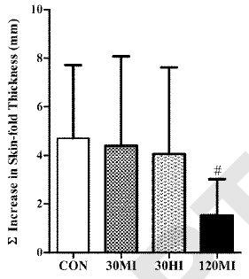 Folosind aceasta tehnica, oamenii de stiinta au comparat 30 de minute de alergare usoara pe banda, 30 de minute de alergare intensa (in care incerci sa mentii o conversatie), 120 de minute de alergare usoara si un grup de control care nu alerga. Iata una dintre masuratorile sistemului imunitar care au rezultat: ingrosarea pielii (MI este intensitate moderata iar HI intensitate ridicata):