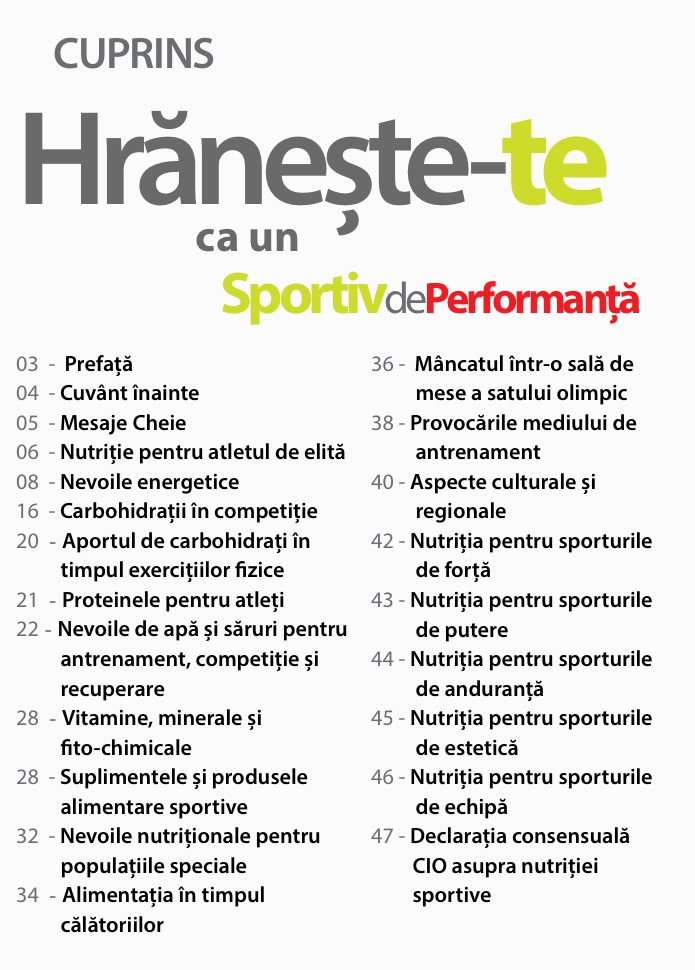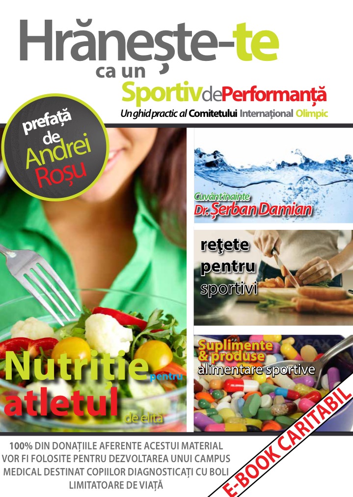 In urma cu aproximativ doi ani, discutand cu bunul nostru prieten de la clinica Superfit, Dr. Serban Damian, despre un ghid de nutritie lansat de catre Comitetul International Olimpic (CIO) in sprijinul tuturor sportivilor de pe aceasta planeta, ne-a venit ideea traducerii, adaptarii si distribuirii acestuia catre toti conationalii nostri interesati de un stil de viata sanatos, care sa includa atat sportul cat si o nutritie corespunzatoare. Am reluat aceasta idee la finalul anului trecut, am obtinut acordul autorilor (ca fapt divers, ambii i-au fost profesori lui Serban la cursurile de acreditare CIO ca specialist in nutritie), apoi ne-am pus pe treaba, cu sprijinul lui Catalin Nicanov (traducere) si George Tudor (tehnoredactare), carora le multumim pentru rezultatul exceptional!
