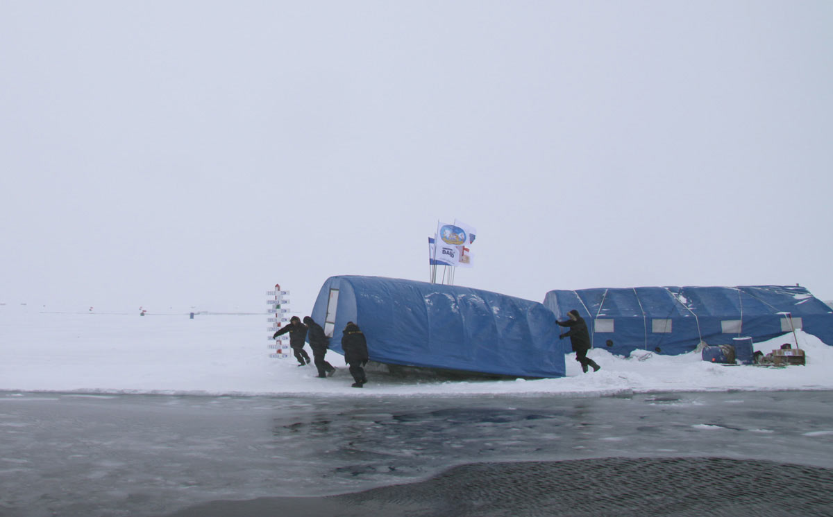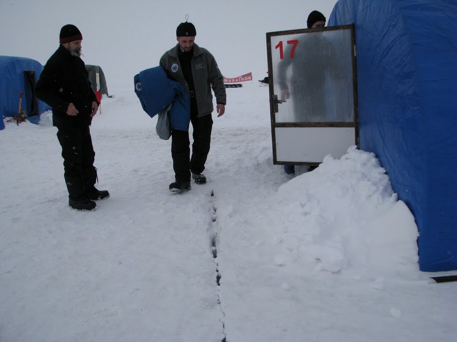 Una dintre acestea a fost momentul in care calota glaciara pe care se afla Camp Barneo a inceput sa se crape… La inceput, pentru doar cativa centimetri (dar intinsa pe cativa kilometri!) – suficient cat sa nu dormim prea linistiti. Apoi, in mijlocul ‘noptii’, am fost treziti de rusii din baza, care au luat pe sus cortul si l-au mutat vreo 100 de metri mai departe, spunandu-ne ca ne putem culca linistiti (evident, nu a mai dormit nimeni :)).